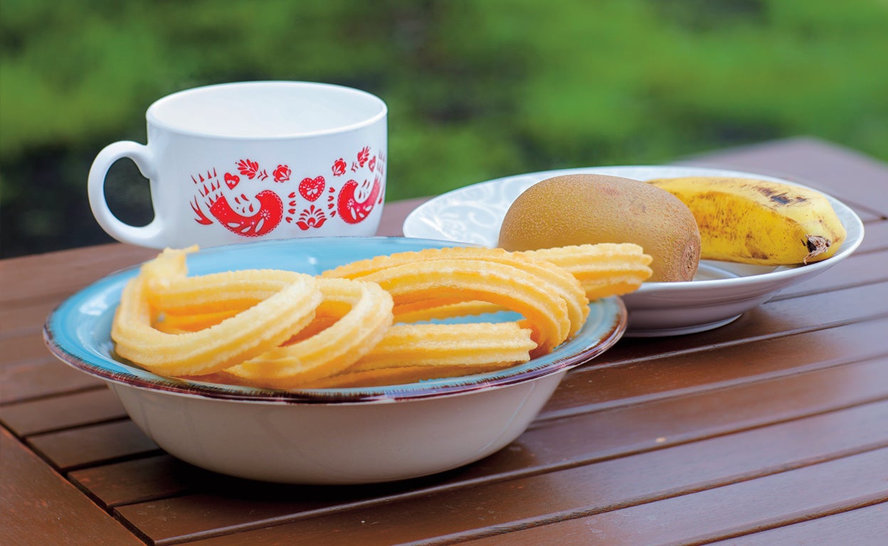 «Si estoy en España, un café con leche con un par de churros, un kiwi, o una manzana, y un plátano. Fuera, si no hay churros, me adapto a la bollería que haya».