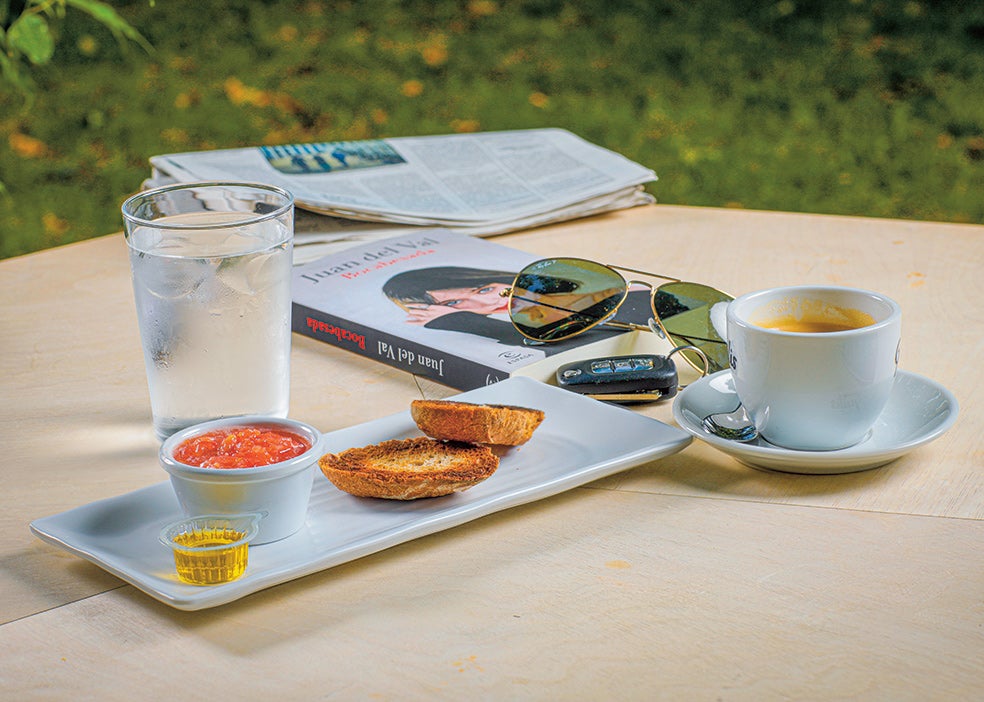 «Cualquier tipo de rebanadas de pan muy tostadas, casi quemadas, con aceite y sal. Un vaso grande de agua muy muy fría (con mucho hielo) y un café solo».