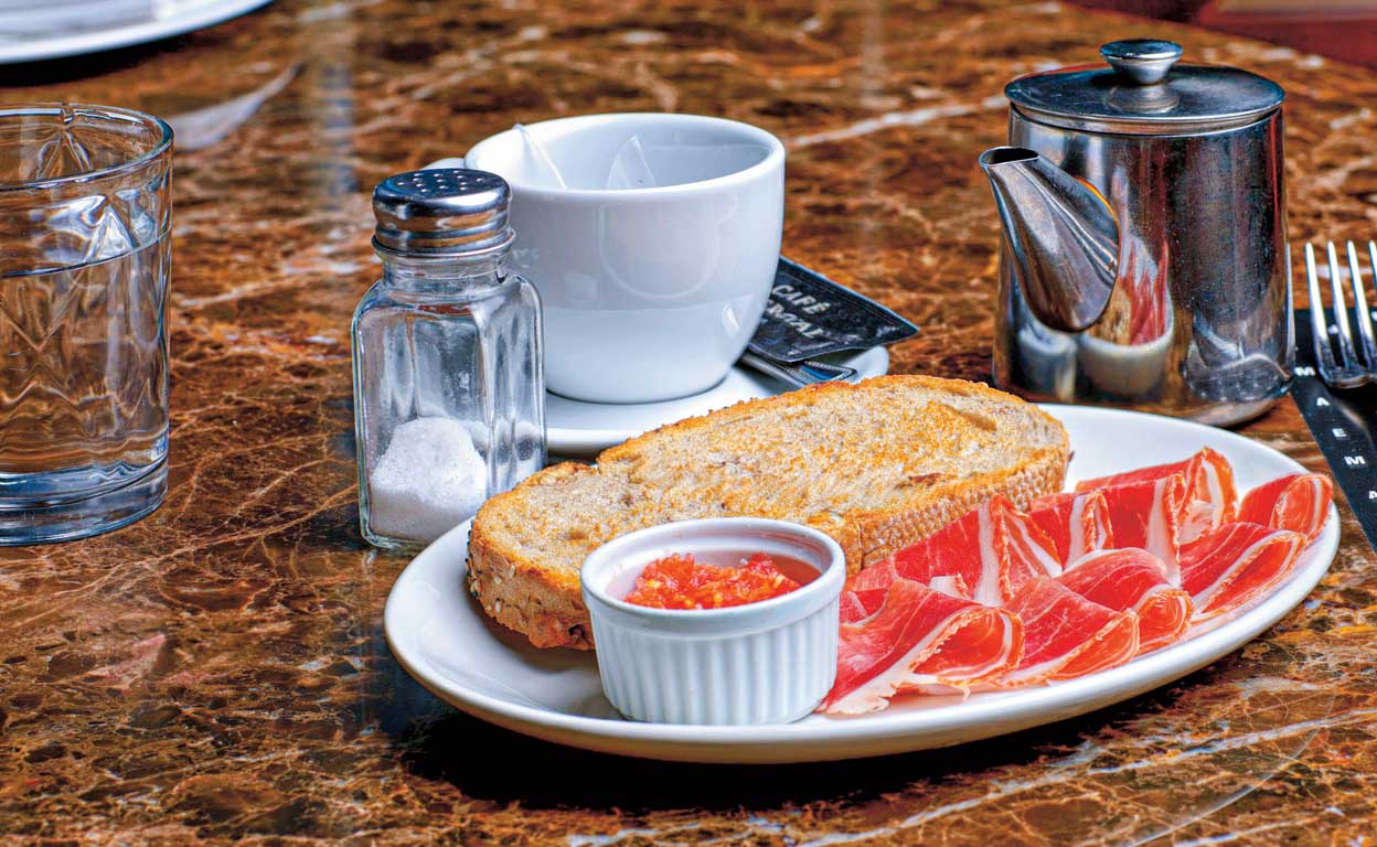 «Café con leche. Una rebanada (tostada) de pan con harina de espelta, con aceite de oliva virgen extra y unas lonchas de jamón ibérico cuando se puede [ríe]».