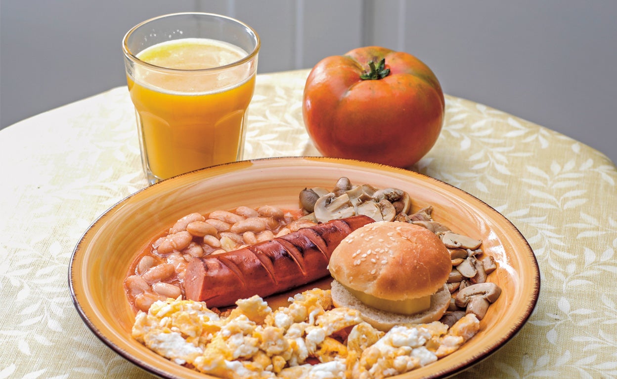 «El que más me gusta: huevos revueltos, salchicha, champiñones, morcilla, judías, minihamburguesa de patata y medio tomate. Y un café con leche de avena».