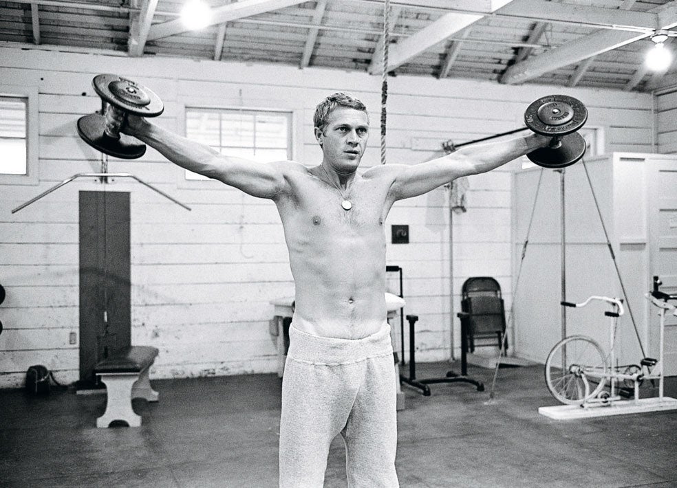 McQueen, en el gimnasio de la Paramount. «Una señal de la confianza de los estudios en que sería la próxima estrella es que le dieron un vestuario propio, el que había sido de Gary Cooper».