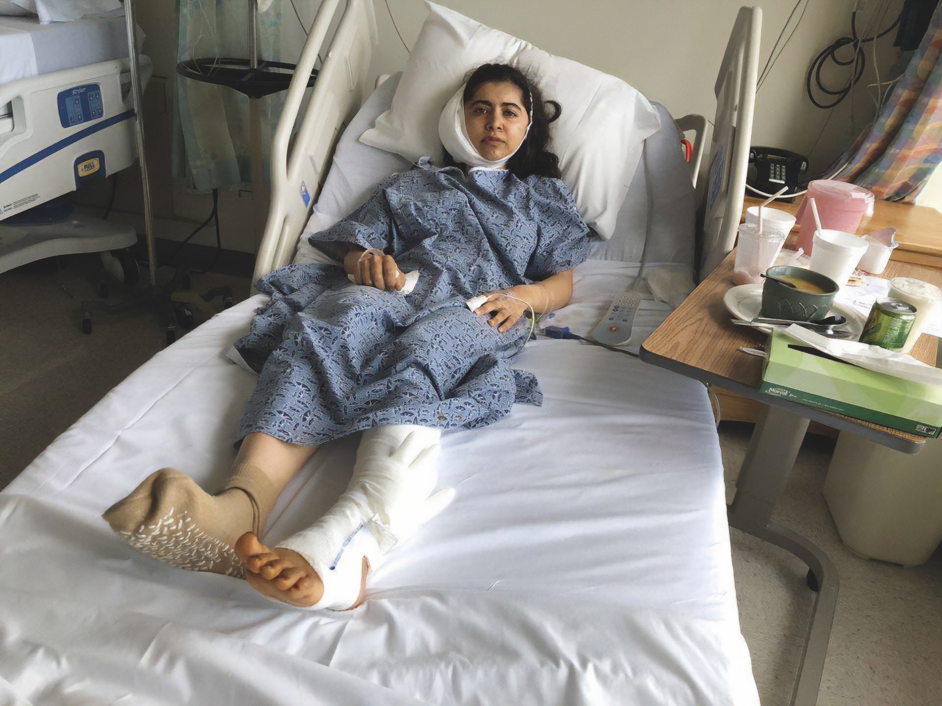 Malala en el hospital de Birmingham a donde fue trasladada para una delicada intervención desde Pakistán tras el atentado que casi le cuesta la vida en 2012. El 9 de octubre de ese año, Malala regresaba a su casa, en el valle de Swat (Pakistán), en el autobús escolar cuando dos hombres armados detuvieron el vehículo. Uno de ellos subió al autobús, preguntó por Malala y, cuando ella se identificó, le disparó a quemarropa en la cabeza. Milagrosamente, sobrevivió, aunque sufre secuelas como parálisis facial y pérdida auditiva.