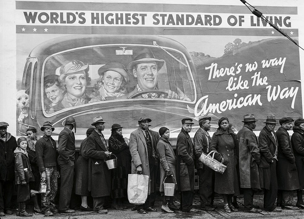 El inicio de la Gran Depresión suele fecharse el martes 29 de octubre de 1929, con el crack de la Bolsa. Pero fueron los desastres medioambientales los que la hicieron 'grande'. Primero fue la sequía. El llamado Dust Bowl ('cuenco de polvo') se prolongó entre el 32 y el 36 y fue uno de los peores desastres ecológicos del siglo XX. Luego, las inundaciones. El río Ohio se desbordó en 1937. Murieron 400 personas y 175.000 fueron evacuadas. En Louisville, las colas para comer, como la de la foto, se multiplicaron. Margaret supo captar la ironía de la América del progreso, que ella misma 'vendía' en la revista Fortune.