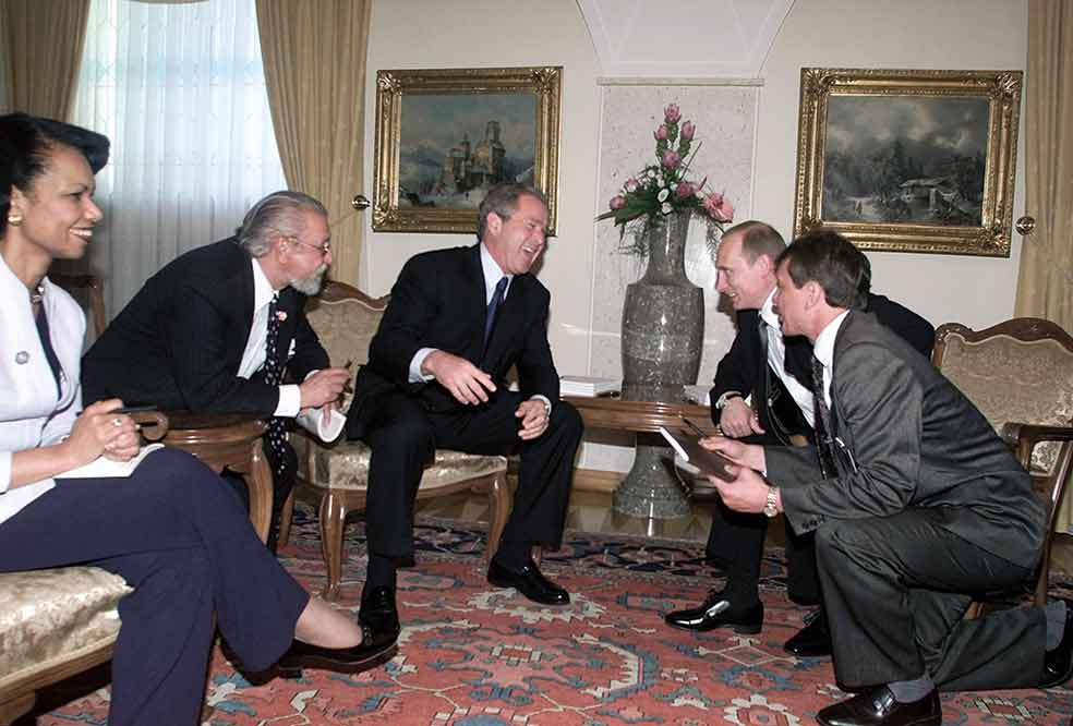 George W. Bush, tras su primer encuentro con Putin en 2001, dijo que lo había mirado a los ojos y lo había encontrado «digno de confianza». Sin embargo, Condoleezza Rice –entonces secretaria de Estado y presente en muchos encuentros con Putin– recuerda ahora otros 'detalles'. «Siempre estuvo obsesionado con los 25 millones de rusos 'atrapados' fuera de la madre Rusia por la desintegración de la Unión Soviética. Lo planteó una y otra vez. Para él, el fin del imperio soviético fue la mayor catástrofe del siglo XX». A pesar de ello, la relación entre ambos países era fluida. Putin fue el primero en llamar a Bush tras el 11-S y un gran aliado en lo que denominaron 'la guerra contra el terror'. A Putin le sirvió para justificar su guerra en Chechenia.