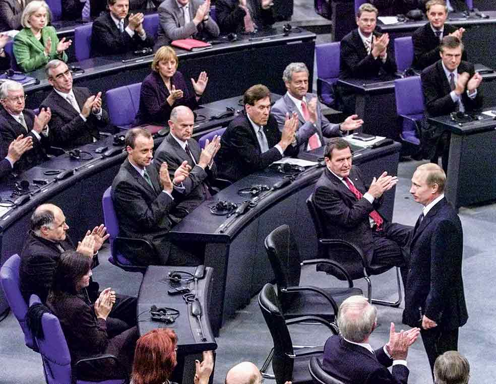 El 25 de septiembre de 2001, Putin se dirigió al Parlamento germano en un fluido alemán. «Rusia es una nación europea amiga –declaró–. La paz estable en el continente es un objetivo primordial para nosotros». Los diputados lo aplaudieron con fervor. Aunque es verdad que Alemania necesitaba su gas y su petróleo (el entonces canciller Schroeder acabaría siendo consejero de Gazprom –el gigante energético ruso– y sigue siendo uno de sus principales valedores), un político presente entonces, Norbert Röttgen –presidente de la Comisión de Exteriores–, reconoce hoy a The New York Times: «Putin nos cautivó». Y, como todos los demás, se levantó para aplaudirlo.