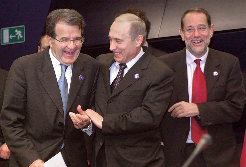 Durante los primeros ocho años de mandato de Putin, la economía rusa despegó (teniendo en cuenta que en los noventa se llegó a pasar hambre en el país y el Estado suspendió pagos en varias ocasiones). En gran medida, el impulso económico se debió a la inversión extranjera en Rusia. A principios de siglo, la clase media no solo comía, sino que viajaba. Pero la corrupción, lejos de controlarse, se consolidó y se fue produciendo una progresiva concentración de riqueza. Según el historiador Timothy Snyder, Putin (en la foto con Romano Prodi y Javier Solana tras una cordial reunión en Bruselas) se fue convirtiendo en un «oligarca en jefe». Lo que contribuyó a la euforia de los mercados y a la suya propia.