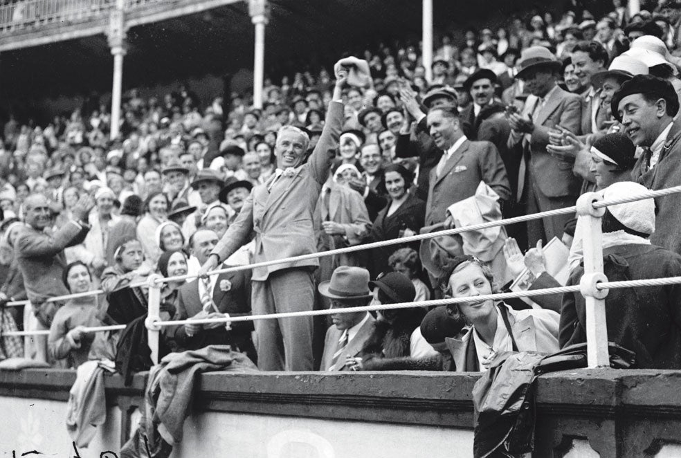 Por San Sebastián pasaban célebres escritores, actores, artistas... Además de los nacionales, como Azorín, Sorolla y Baroja, habituales de sus calles y sus costas, también estuvieron Buster Keaton, Josephine Baker y Charlie Chaplin, en la foto asistiendo a una corrida de toros.